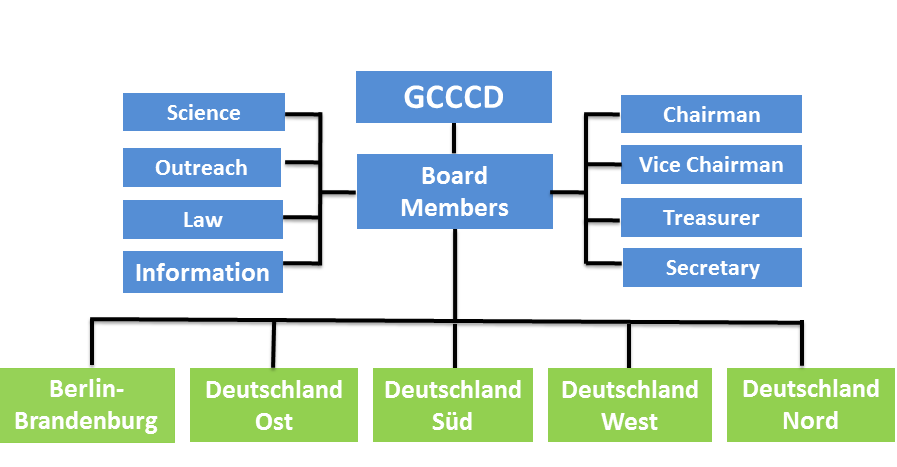 注:2014年10月以前,GCCCD地方分会按照城市或地区建立,包括耶拿、 乌尔姆、斯图加特、 北莱茵威斯特法伦及柏林-布兰登堡分会。 经2014年10月会员大会决定按地域重新划分为五个分会:柏林-勃兰登堡,东德, 南德,西德和北德分会。2015年理事会决定在区域内会员集中城市建立城市分会。